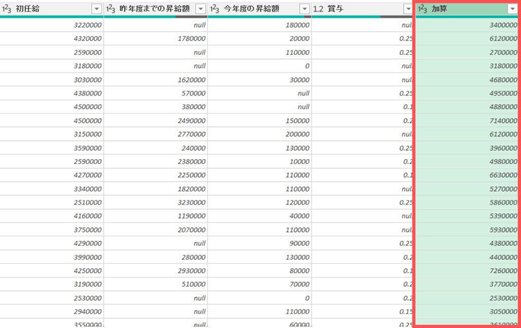 今回は3つの列(初任給、昨年度昇給、今年度昇給)を足したいので、これらをまとめて選択し、【加算】を実行するのが最も手軽です。これでNullが含まれていても正しい合計額(給与合計額)が算出されました。