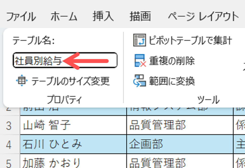 テーブル内をクリックすると、【テーブルデザイン】タブが表示されるので、クリックすると、左上にテーブル名が表示されるので【社員別給与】と入力し、キーボードのエンターキーを押します。