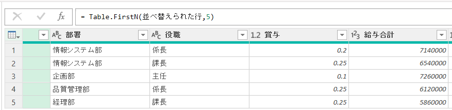 これでトップ5のデータだけが残りました。【賞与】の列を削除して、これをExcelのワークシートに読み込みましょう。