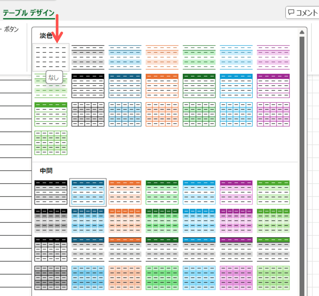 【テーブルデザイン】タブから【テーブルスタイル】を【なし】にします。