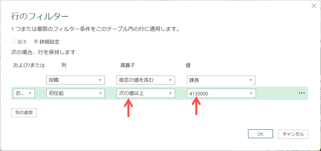 【次の値以上】から【4130000】を選択します。【OK】ボタンを押します。