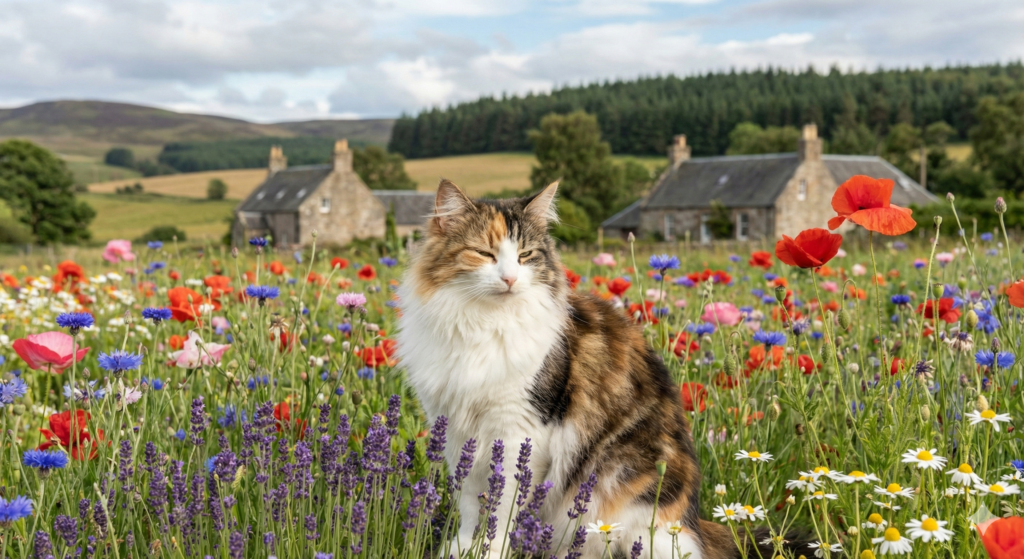 猫が花畑に座っている