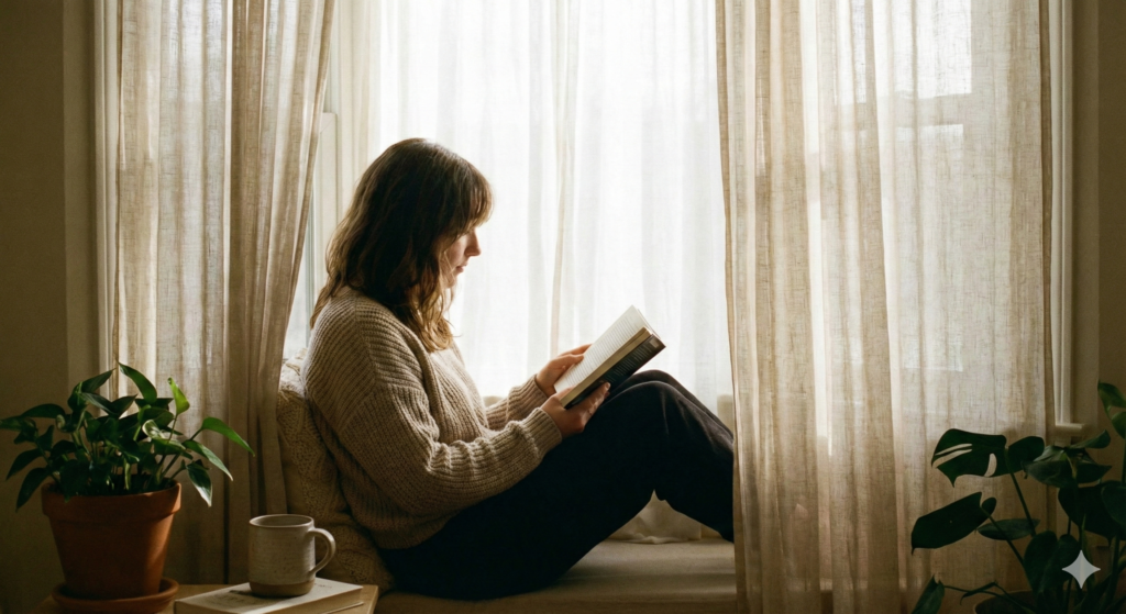 若く、ショートボブで赤いパーカーを着た、本を読んでいる女性