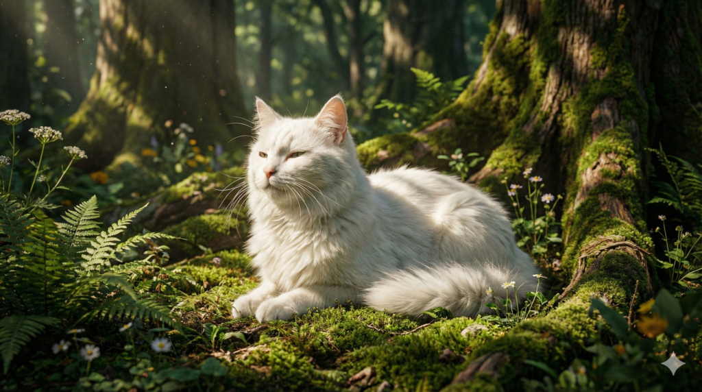 「花畑」が先頭にあるため、AIは「風景画だ」と判断します。カメラは引きの画角になり、広大な花畑の中に猫がぽつんと小さくいる構図になります。