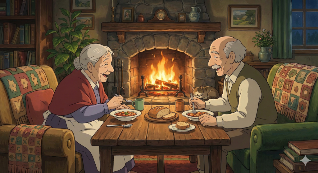 暖炉のある居心地の良いリビングで、食事している夫婦、アニメ映画のような立体感