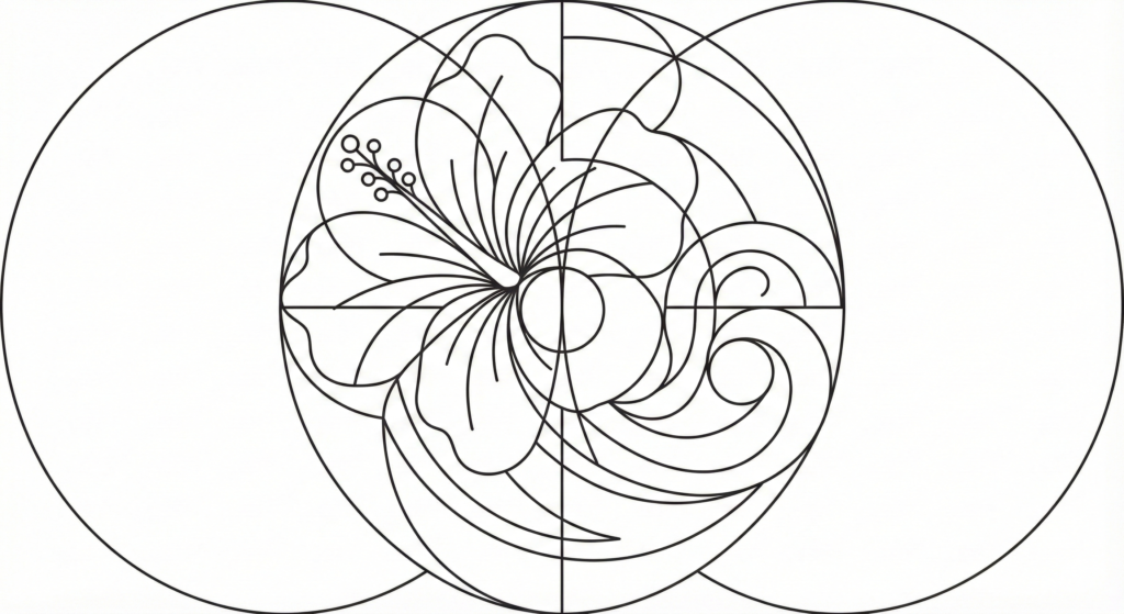 ([高品質ロゴ] ハイビスカスの花と穏やかな波が融合した、洗練された線画のロゴアイコン。黄金比の構図、幾何学的、白背景に優雅な細い黒線。文字なし、アイコンシンボルのみ。)