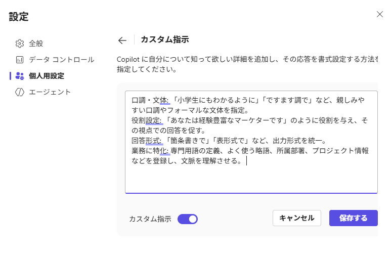 Copilotの振る舞いを自分好みにカスタマイズできます。