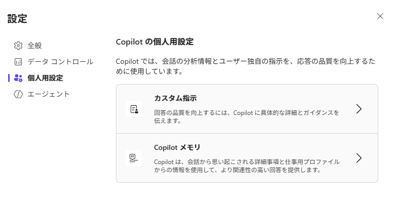 - Copilotメモリ: Copilotが会話から自動で学習・記憶する「文脈」。