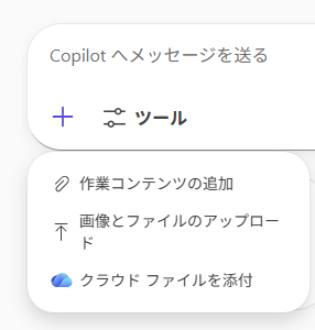 - 機能: お使いのパソコン(ローカル環境)に保存されている**画像やファイル(PDF, Excel, Wordなど)を直接Copilotにアップロードします。