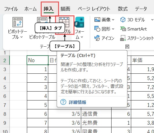 【挿入】タブから【テーブル】をクリックします。※ショートカットキーは、【Ctrl】+【T】です。