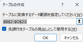 すると【テーブルの作成】ダイアルボックスが表示されます。【先頭行をテーブルの見出しとして使用する】にチェックを入れ、【OK】ボタンを押します。
