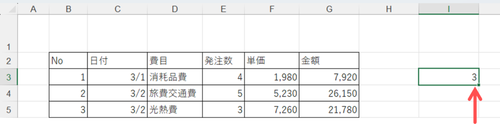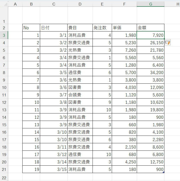 金額の欄に、【発注数】×【単価】を求めるとこの様なカタチになります。そして【キーボード】の【Enter】キーを押します。