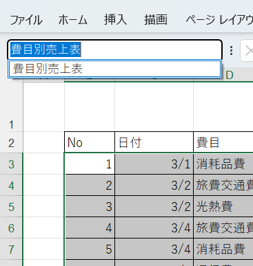 ここでは【費目別売上表】と入力し【Enter】キーを押します。