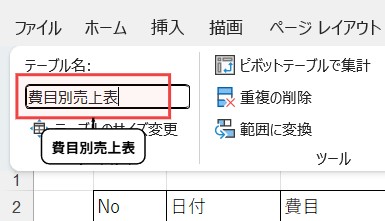 これで【テーブル名】が【費目別売上表】と言う名前になります。