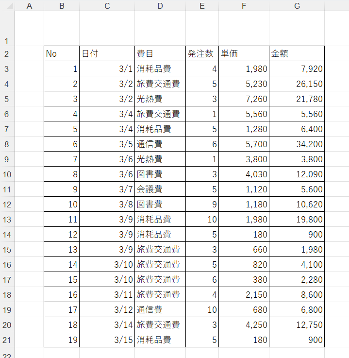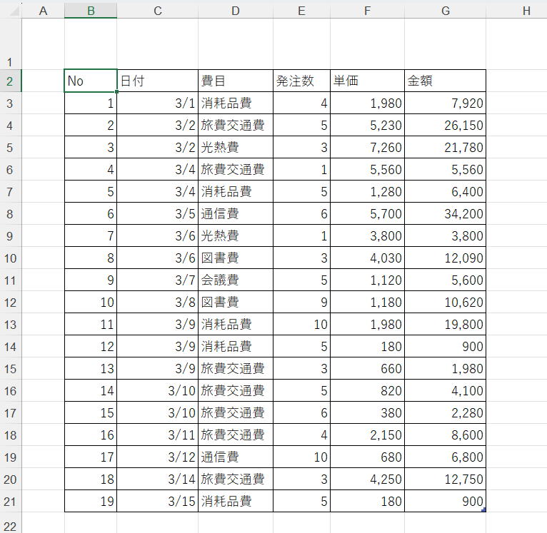 上記のような表が有ります。この表をテーブル化していきます。