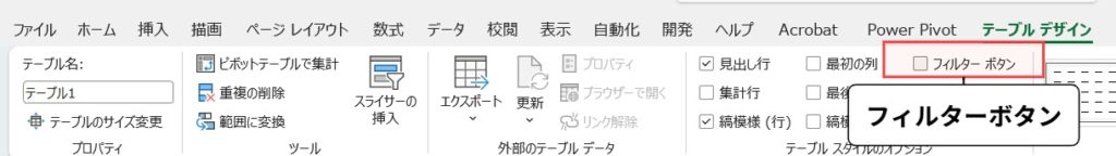 【テーブルデザイン】タブから【フィルターボタン】のチェックを外します。