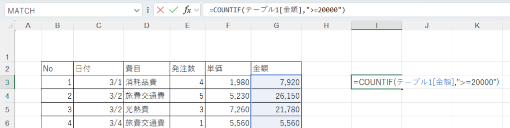COUNTIF関数を使って【金額】が2万以上を求めてみます。