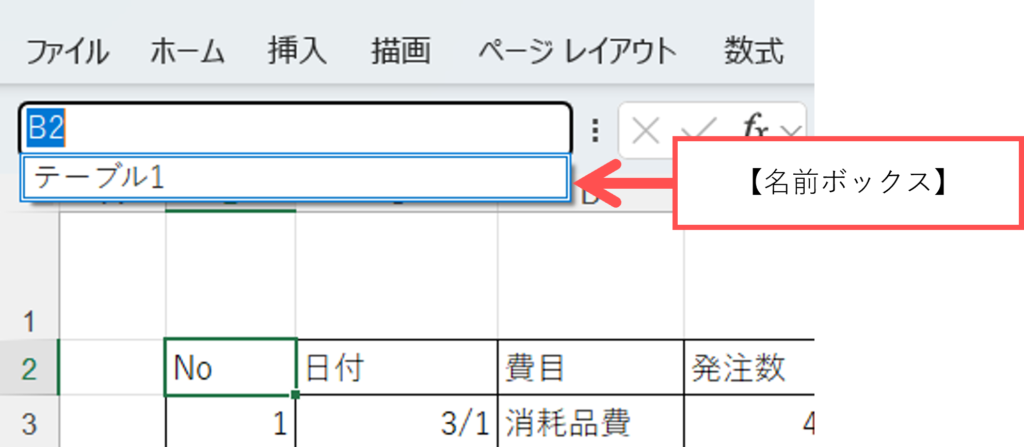 表の中のどこかのセルを選択して、名前ボックスを確認すると、テーブルが入っているので表が【テーブル】と確認出来ます。【名前ボックス】の【テーブル】をクリックすると、自動的にテーブルを選択出来ます。