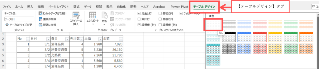 【テーブルスタイル】の色なしをクリックします。