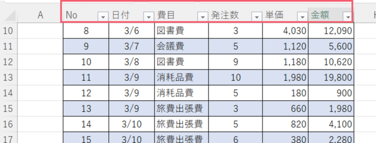 表をテーブル化すると見出しの項目が自動で設定される(ヘッダーとなる)