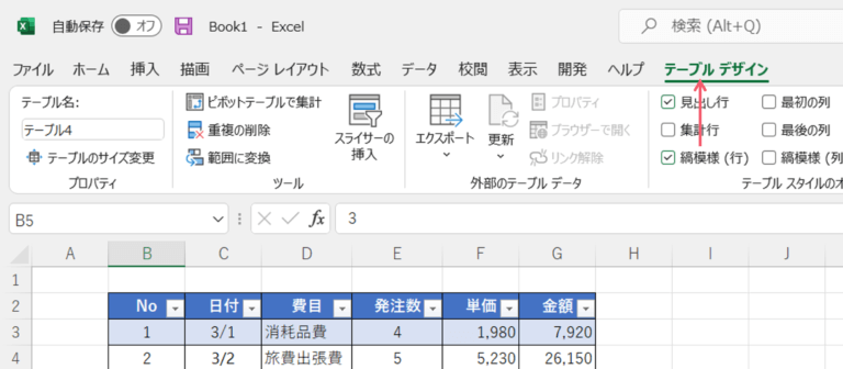 表内をクリックして選択すると、【テーブルデザイン】タブが表示されます。表をテーブルとして設定していないとテーブルデザインタブは出てきません。