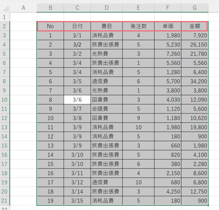 表をテーブル化しない状態でキーボードの【Ctrl】+【A】を押すと、項目まで選択されてしまいます。
