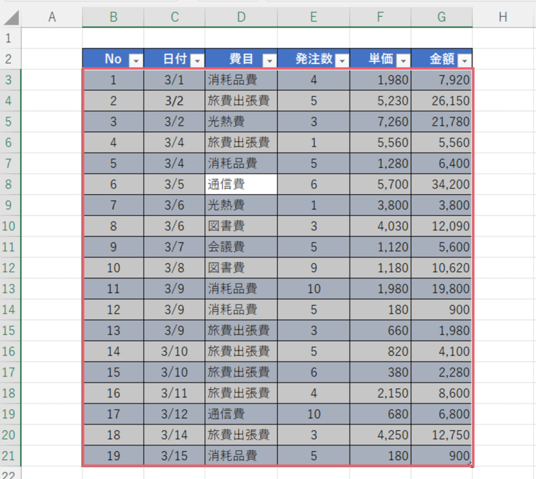 色やフィルターボタンがなくてもテーブルとして見分ける方法