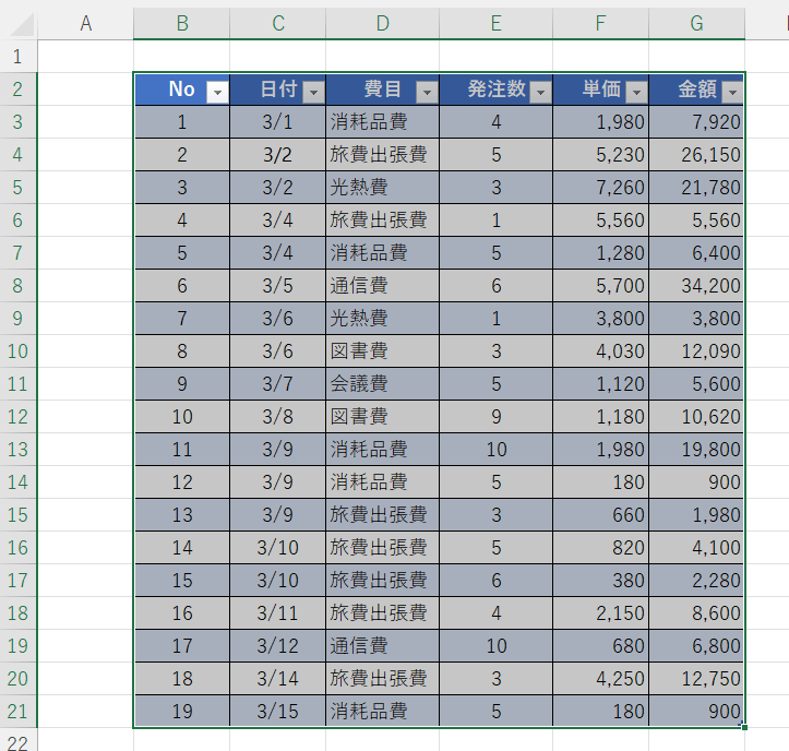 テーブルに変換されたところ。項目名が濃い青に、データ部分に水色と白の色が一行おきにつきます。項目名のオートフィルターのボタンが付きます。