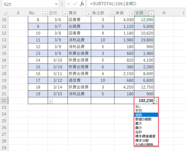最終行に上記の様なプルダウンリストが表示されて、表の集計をする事が出来ます。