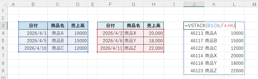 まず、VSTACK関数を使って、点在するすべての売上データを一つにまとめます。