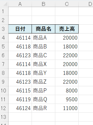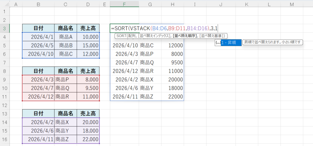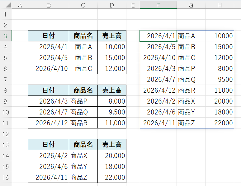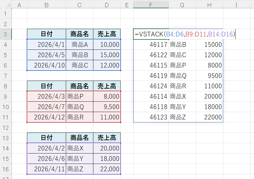 次に、VSTACK関数と他の関数を組み合わせることで、さらに高度なデータ整理ができることをご紹介します。ここでは、複数の場所に散らばった売上データを一つに集約し、さらに「日付順」に自動で並べ替える方法を見ていきましょう。