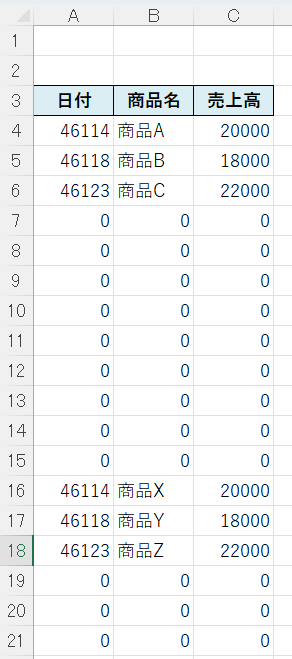 =FILTER(VSTACK(品川:秋葉原店!A4:C15), VSTACK(品川:秋葉原店!A4:A15)<>0)