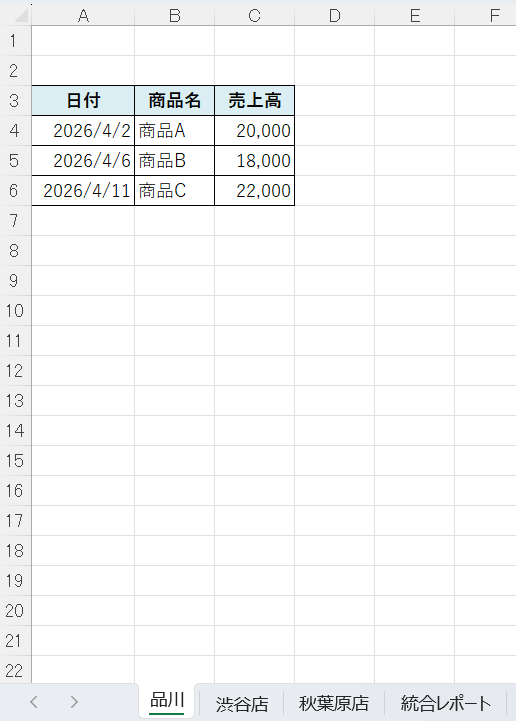 ここでは、「品川店」「渋谷店」「秋葉原店」という3つの支店の売上データが、それぞれ別のシートに保存されていると仮定します。これらのデータを一つの「統合レポート」シートにまとめる手順を見ていきましょう。