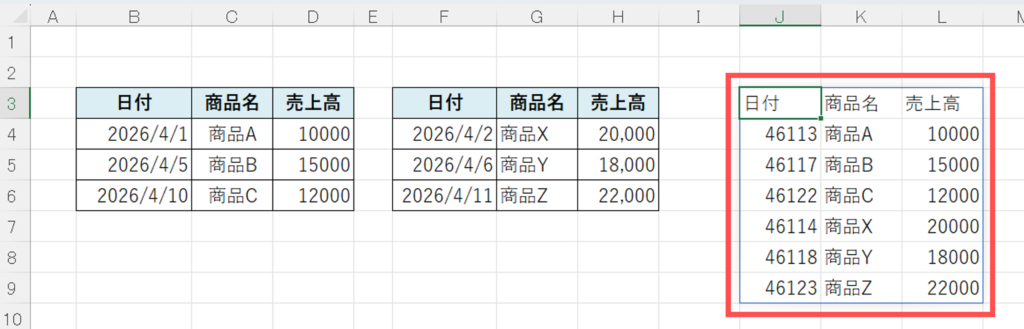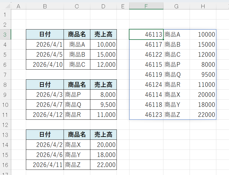 この数式を入力するだけで、複数の場所に散らばっていたデータが一つにまとまり、さらに日付順にきれいに並べ替えられた表が自動的に完成します。手作業で一つずつ並べ替える手間がなくなるだけでなく、常に最新のデータが日付順に整理されるため、分析や確認作業が非常にスムーズになります。