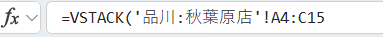 第1引数: VSTACK(‘品川:秋葉原店’!A4:C15) で、3シート分のA〜C列のデータを縦に結合します。